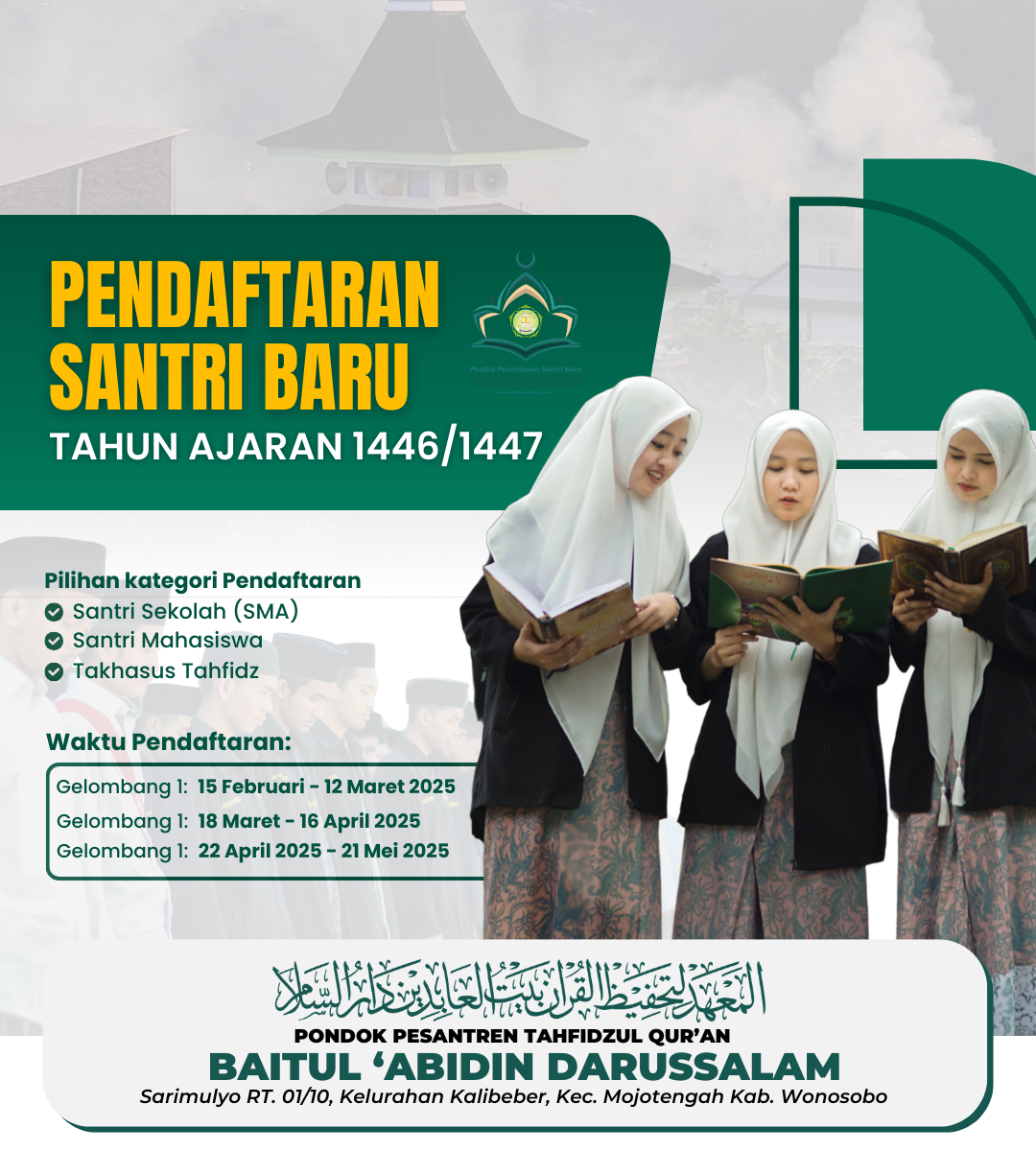 Berikut syarat pendaftaran santri baru PPTQ Baitul 'Abidin Darussalam 2025.